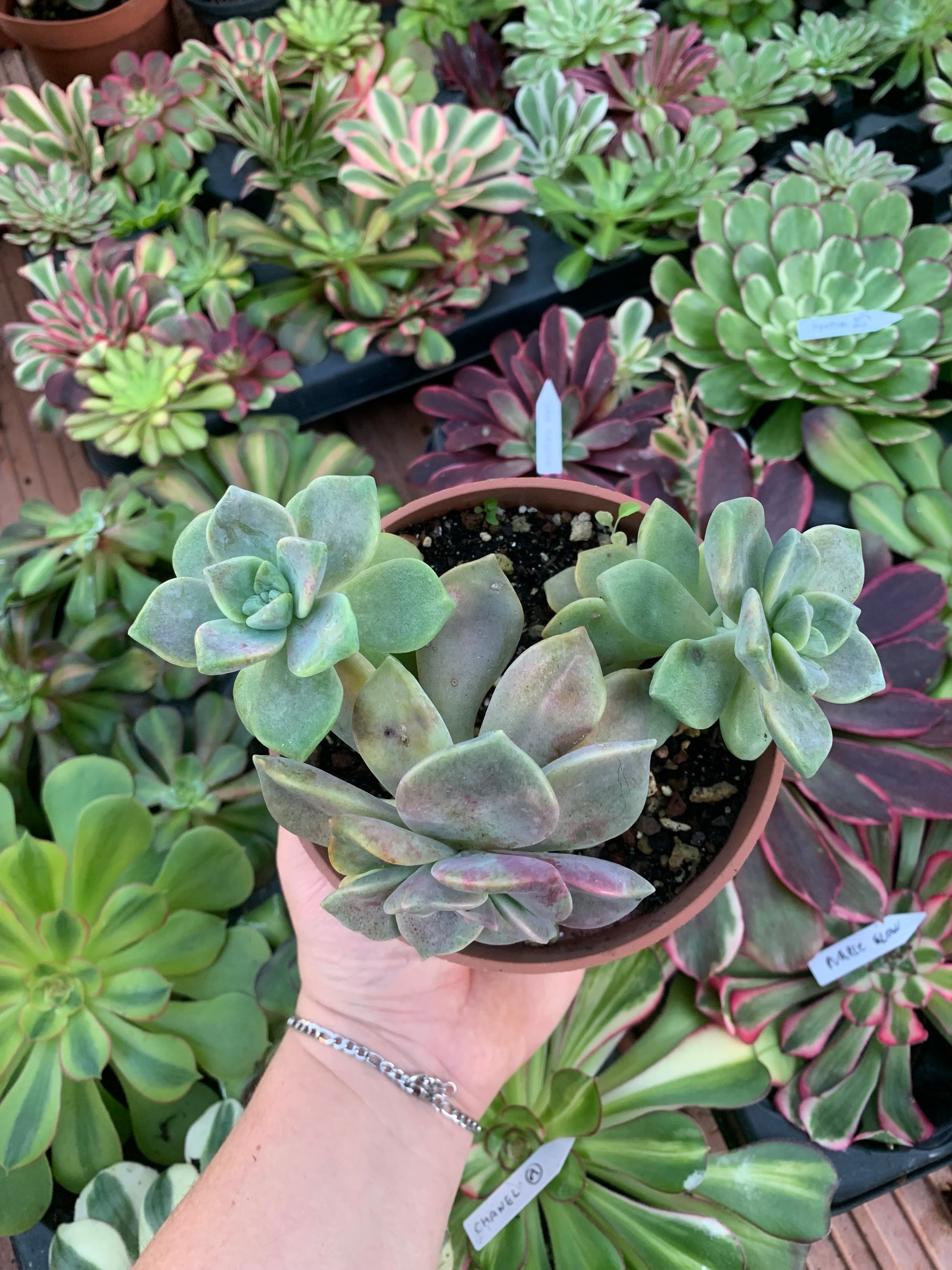 Suculenta cultivada en vivero exterior todo el año. Este tipo de cultivo favorece el crecimiento con tallo leñoso y aporta robustez y toda la belleza a la suculenta, signo de buena salud y que proporciona al aeonium una adecuada adaptación a su nuevo entorno.