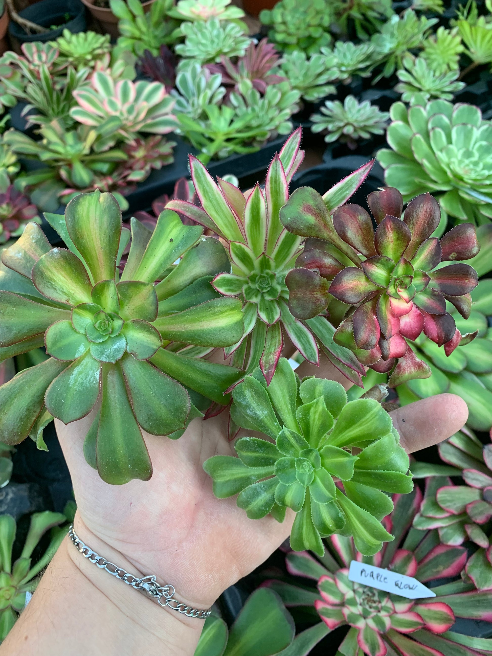 Suculenta cultivada en vivero exterior todo el año. Este tipo de cultivo favorece el crecimiento con tallo leñoso y aporta robustez y toda la belleza a la suculenta, signo de buena salud y que proporciona al aeonium una adecuada adaptación a su nuevo entorno.