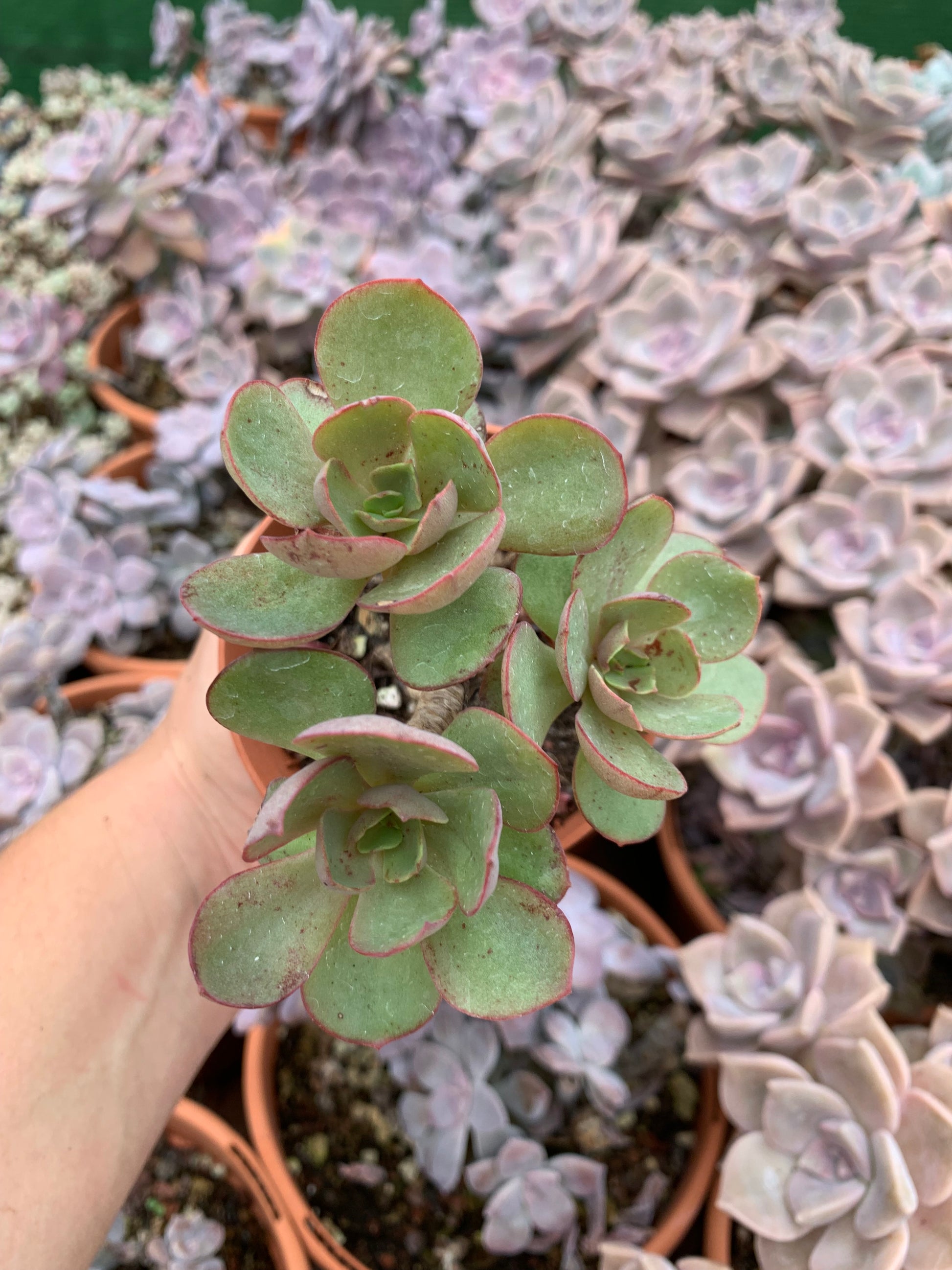 Suculenta cultivada en vivero exterior todo el año. Este tipo de cultivo favorece el crecimiento con tallo leñoso y aporta robustez y toda la belleza a la suculenta, signo de buena salud y que proporciona al aeonium una adecuada adaptación a su nuevo entorno.